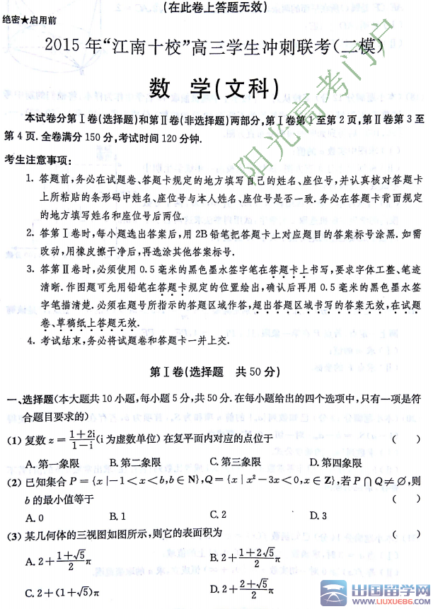 出國留學網(wǎng)高考頻道整理《2015江南十校聯(lián)考二模文科數(shù)學試題》,供高考考生參考。2015江南十校聯(lián)考二模文科數(shù)學試題,不僅可以檢驗考生的復習情況,還能讓考生從中總結(jié)經(jīng)驗、查漏補缺,同時也是對高考生心理承受力的一次錘煉。