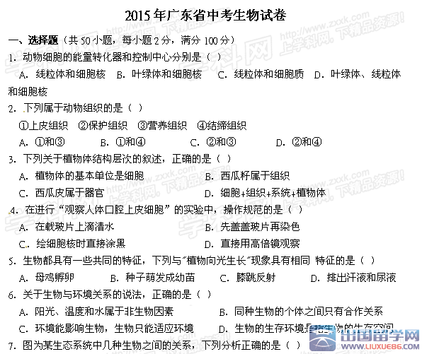 停下休息的時候不要忘記別人還在奔跑。出國留學網中考頻道的小編會及時為廣大考生提供:2015年廣東中考生物試題及答案 ,有需要的考生可以在考題公布后刷新本頁面(按ctrl+F5),希望對大家有所幫助。