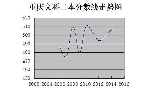 重慶文科二本分?jǐn)?shù)線2006年到2012年波動(dòng)比較大,從2012年起分?jǐn)?shù)線開始上漲,由上圖可以預(yù)測(cè)2015年重慶文科二本分?jǐn)?shù)線很有可能上漲,預(yù)計(jì)510分左右! (以上數(shù)據(jù)僅供參考!)