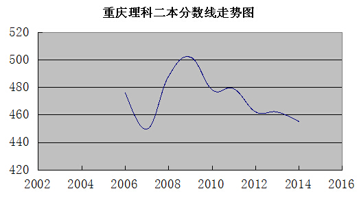 重慶理科二本分?jǐn)?shù)線2006年到2008年呈上升趨勢(shì),從2008年起分?jǐn)?shù)線開始連續(xù)下降,由上圖可以預(yù)測(cè)2015年重慶理科二本分?jǐn)?shù)線很有下降或保持不變,預(yù)計(jì)454分左右! (以上數(shù)據(jù)僅供參考!)