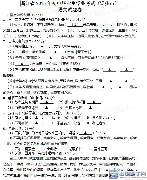 點(diǎn)擊下載>>2015年浙江溫州市中考語文試題及答案