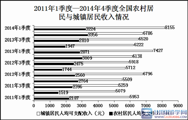 3.D 直接查找題。農(nóng)村最高在2013年4季度,城鎮(zhèn)最高在2014年1季度。故選D。