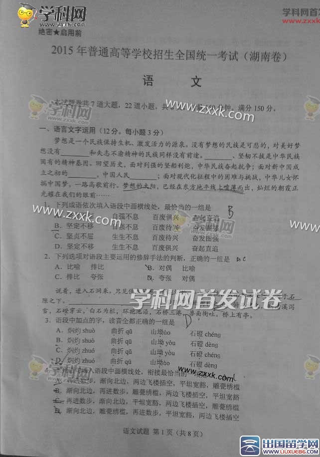 十年寒窗,在此一搏!高考即將來臨,一次決定成敗的挑戰(zhàn)即將開始。無論你現(xiàn)在是成竹在胸,還是茫無頭緒,不知所措,你都不能退縮。今年的湖南高考真題將在考后公布,出國留學(xué)網(wǎng)高考頻道小編將緊密關(guān)注2015年湖南高考語文真題及答案,在此頁面將及時公布,請學(xué)子們及家長密切關(guān)注本頁面。如果真題及答案沒有顯示,那么請按Ctrl+F5刷新。為了能及時知曉2015湖南高考語文真題及答案,建議大家按Ctrl+D收藏我們網(wǎng)站!