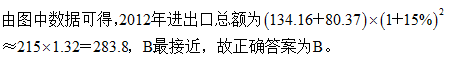解析 分析選項可以采用尾數(shù)法,將每年的進出口額的尾數(shù)相加為3+0+5+4+7+1+8+0+6+7,可知尾數(shù)為1,答案為B。