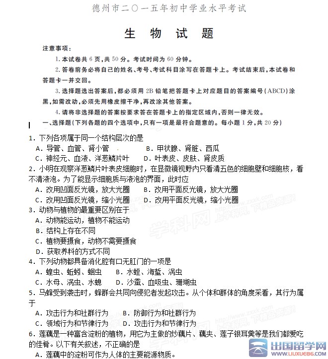 勤奮,是步入成功之門的通行證。出國留學(xué)網(wǎng)中考頻道的小編會及時為廣大考生提供:2015年山東德州市中考生物試題及答案,有需要的考生可以在考題公布后刷新本頁面(按ctrl+F5),希望對大家有所幫助。
