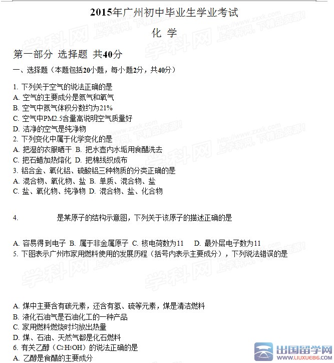 再長的路,一步步也能走完,再短的路,不邁開雙腳也無法到達。出國留學網(wǎng)中考頻道的小編會及時為廣大考生提供:2015年廣東廣州市中考化學試題及答案,有需要的考生可以在考題公布后刷新本頁面(按ctrl+F5),希望對大家有所幫助。