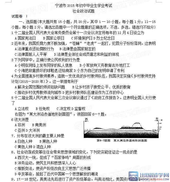 強(qiáng)烈的信仰會(huì)贏取堅(jiān)強(qiáng)的人,然后又使他們更堅(jiān)強(qiáng)。出國(guó)留學(xué)網(wǎng)中考頻道的小編會(huì)及時(shí)為廣大考生提供:2015年浙江寧波市中考政治試題及答案,有需要的考生可以在考題公布后刷新本頁(yè)面(按ctrl+F5),希望對(duì)大家有所幫助。