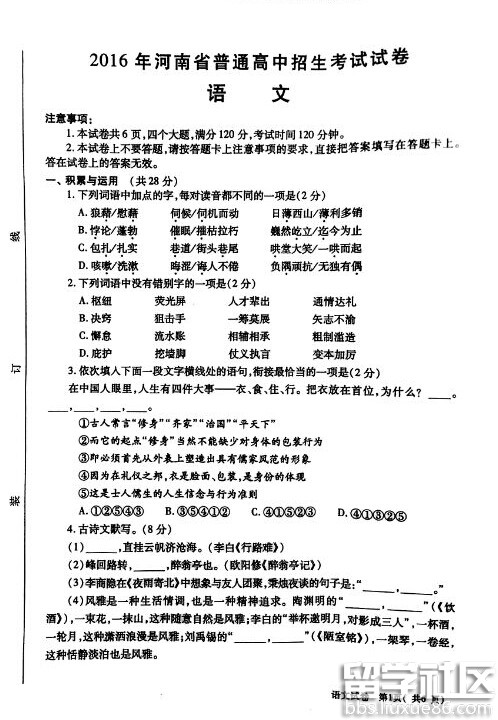 2016年河南安陽(yáng)中考語(yǔ)文試題(含答案)