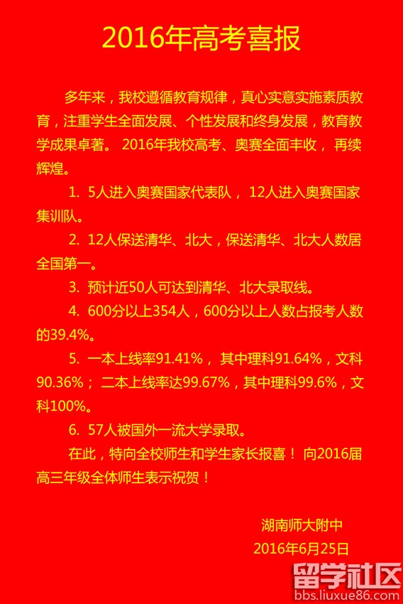 出國留學(xué)網(wǎng)高考網(wǎng)為大家提供2016湖南師大附中高考喜報,更多高考喜報請關(guān)注我們網(wǎng)站的更新!