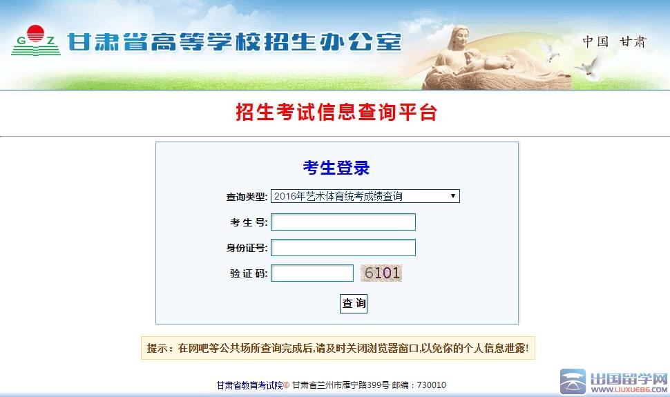 出國留學(xué)網(wǎng)高考網(wǎng)為大家提供甘肅2016高考體育類專業(yè)統(tǒng)考成績(jī)查詢?nèi)肟冢篽ttp://gaokao.gszs.cn/,更多體育高考資訊請(qǐng)關(guān)注我們網(wǎng)站的更新!