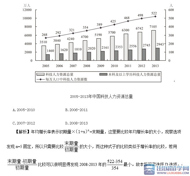 2016年京考-(題目來(lái)自考生回憶)下列時(shí)間段中,哪個(gè)時(shí)間段內(nèi)每萬(wàn)人口中科技人力資源數(shù)年均增速最慢?( )