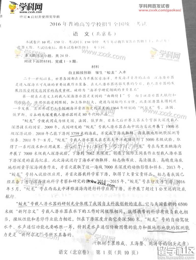高考著實(shí)是一種豐收,它包蘊(yùn)著太多的內(nèi)涵。無論高考成績?nèi)绾危愕某砷L與成熟是任何人無法改變的事實(shí),這三年的辛勤走過,你獲得的太多太多。出國留學(xué)網(wǎng)高考頻道會(huì)及時(shí)為廣大考生提供2016北京高考語文真題(圖片版) ,同時(shí)接下來的幾個(gè)科目真題及答案亦會(huì)在此頻道顯示,請考試及家長關(guān)注本站更新(ctrl D收藏即可)。更多北京高考分?jǐn)?shù)線、北京高考成績查詢、北京高考志愿填報(bào)、北京高考錄取查詢信息等信息請關(guān)注我們網(wǎng)站的更新!
