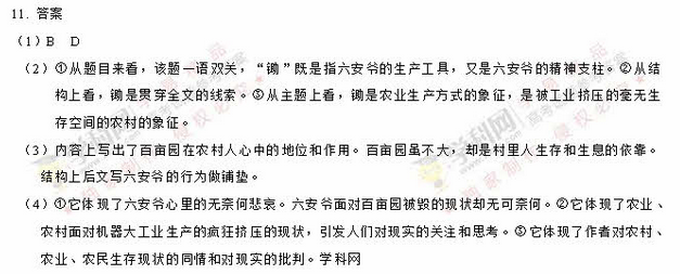 (4)“我不是鋤地,我是過癮”這句話,既是理解六安爺?shù)年P(guān)鍵,也是理解小說主旨的關(guān)鍵,請結(jié)合全文進行分析。(8分)