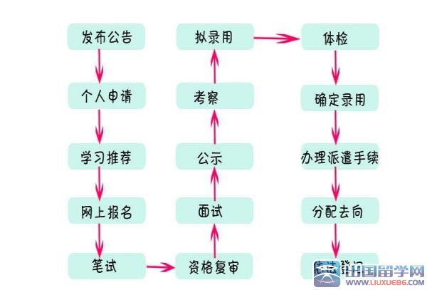 發(fā)布公告-個人申請-學(xué)習(xí)推薦-網(wǎng)上報名-筆試-資格復(fù)審-面試-公示-考察-擬錄用-體檢-確定錄用-辦理派遣手續(xù)-分配去向-依法登記。