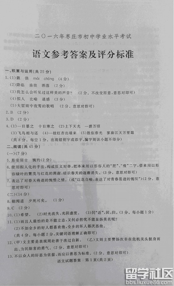 2016年山東棗莊中考語(yǔ)文試題及答案