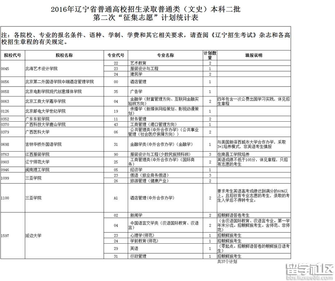 2016遼寧本科二批第二次征集志愿計劃(文史)