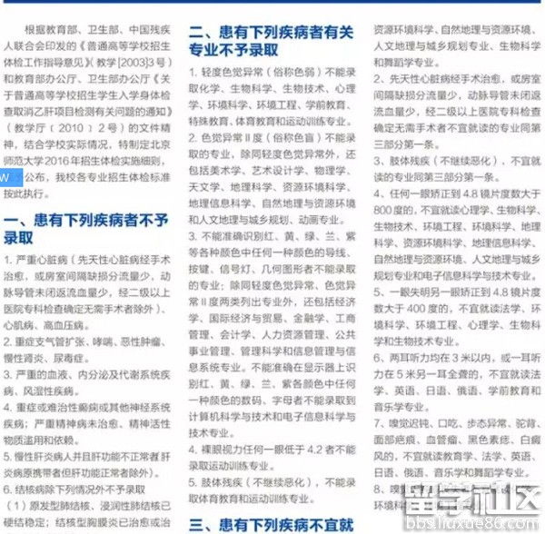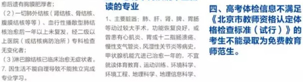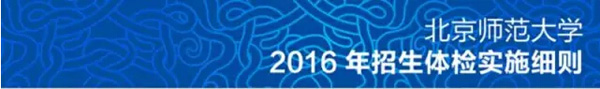 11. 體檢標(biāo)準(zhǔn)按我校根據(jù)教育部、衛(wèi)生部、中國殘疾人聯(lián)合會(huì)印發(fā)的《普通高等學(xué)校招生體檢工作指導(dǎo)意見》和教育部辦公廳、衛(wèi)生部辦公廳《關(guān)于普通高等學(xué)校招生學(xué)生入學(xué)身體檢查取消乙肝項(xiàng)目檢測(cè)有關(guān)問題的通知》(教學(xué)廳﹝ 2010 ﹞ 2 號(hào))制定的《北京師范大學(xué) 2016 年招生體檢實(shí)施細(xì)則》執(zhí)行。