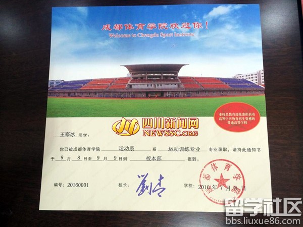 8日上午,2016年四川省第一封高考錄取通知書將從成都體育學院發(fā)出,名為王寒冰的考生將成為省內(nèi)首位拿到錄取通知書的學子,他被成都體育學院運動系運動訓練專業(yè)錄取。