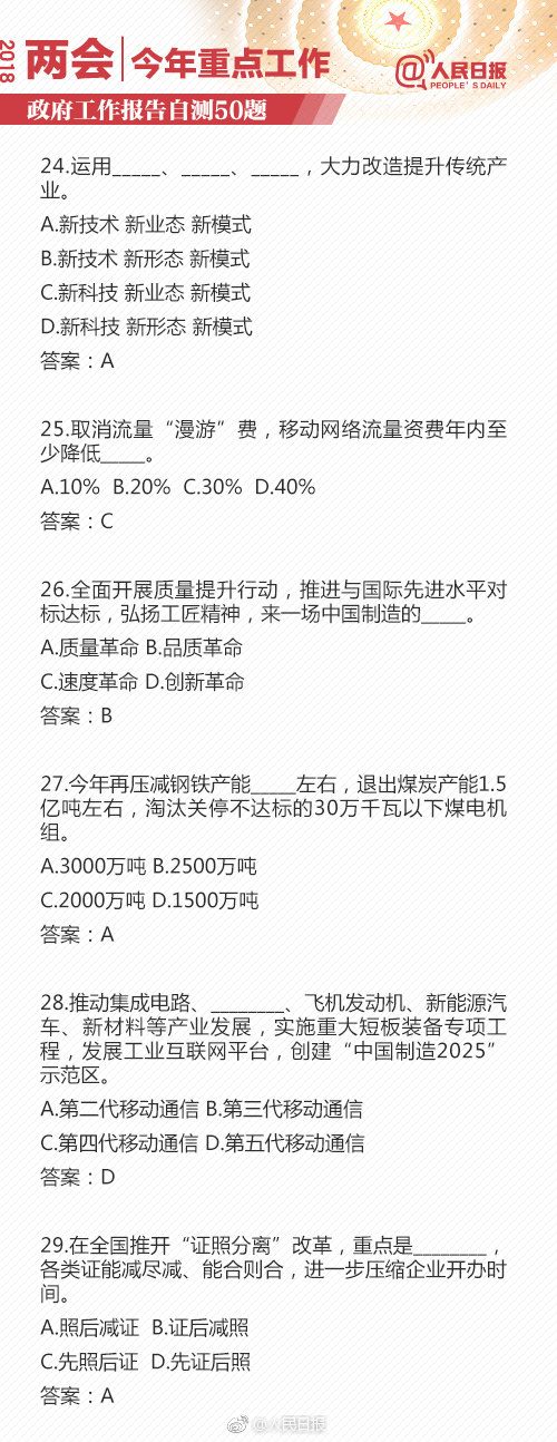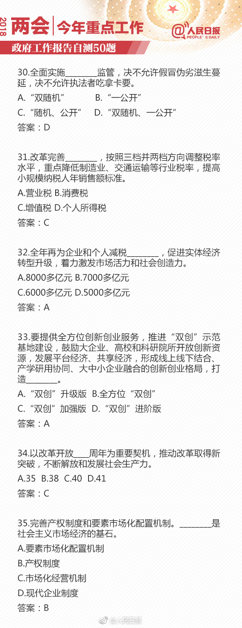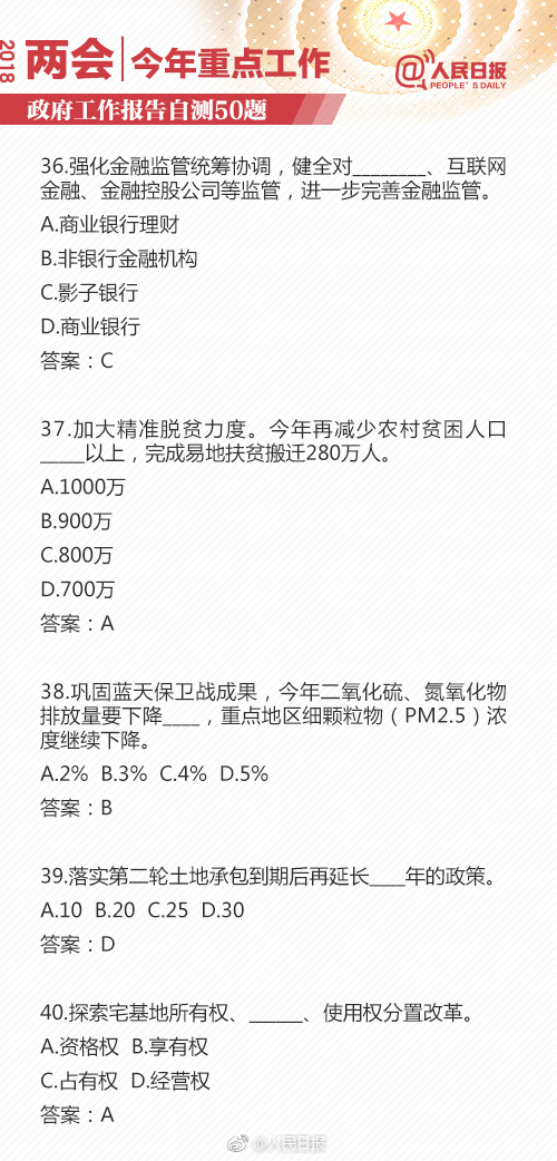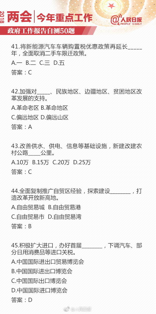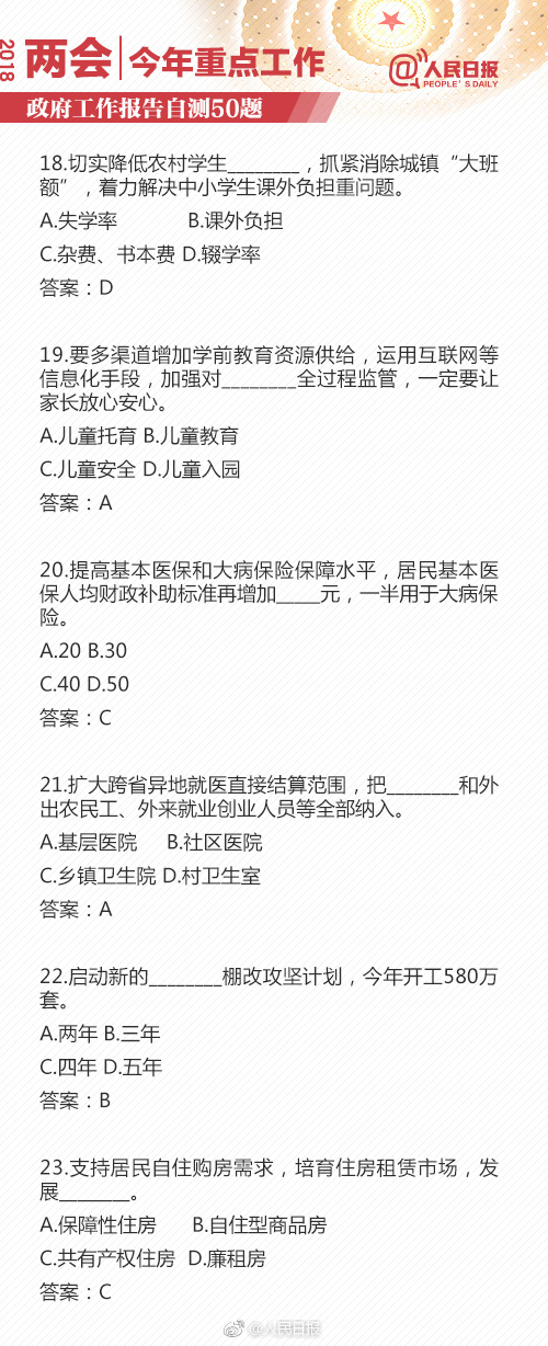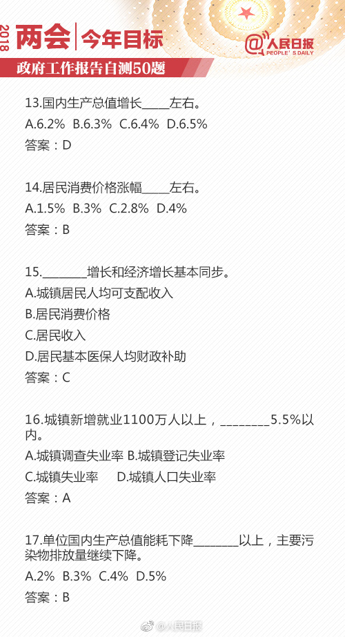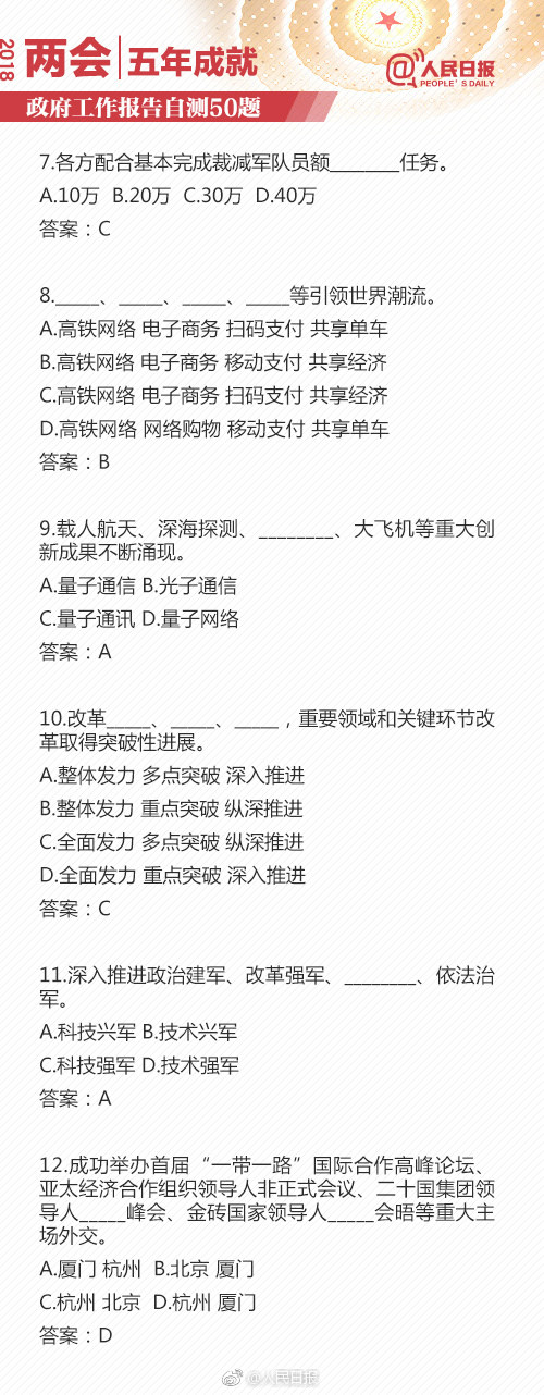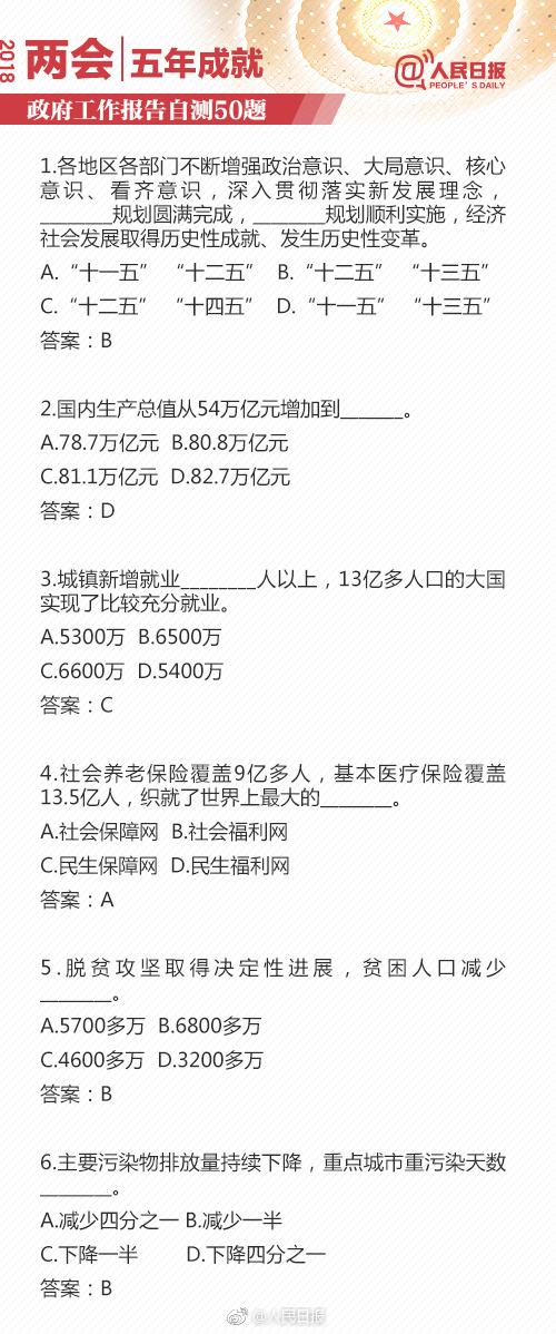 近2萬(wàn)字的2018年政府工作報(bào)告,涉及經(jīng)濟(jì)、就業(yè)、扶貧等多個(gè)方面。過(guò)去五年,我國(guó)都取得了哪些成就?今年的新目標(biāo)、新詞匯你都掌握了嗎?新一年又有哪些民生福利?50道選擇題,帶你了解政府工作報(bào)告重點(diǎn)。