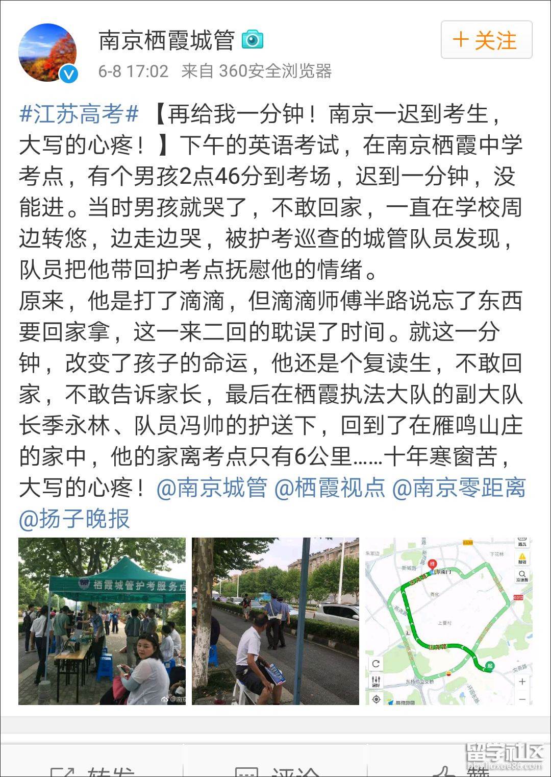 8日,網(wǎng)曝南京一高考考生因滴滴拼車(chē)遲到,導(dǎo)致無(wú)法進(jìn)入高考考場(chǎng)。據(jù)@南京棲霞城管 6月8日消息稱,下午的英語(yǔ)考試,在南京棲霞中學(xué)考點(diǎn),有個(gè)男孩2點(diǎn)46分到考場(chǎng),遲到一分鐘,沒(méi)能進(jìn)。被護(hù)考巡查的城管隊(duì)員發(fā)現(xiàn)并安撫情緒。經(jīng)問(wèn)詢發(fā)現(xiàn),該考生是打了滴滴,但滴滴師傅半路說(shuō)忘了東西要回家拿,這一來(lái)二回的耽誤了時(shí)間。他的家離考點(diǎn)只有6公里。