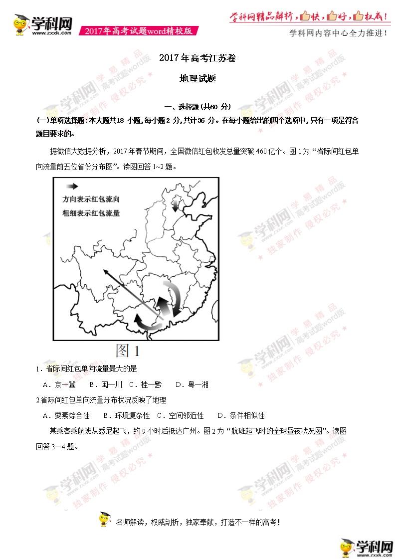江蘇高考地理2017年真題及答案(完整版)
