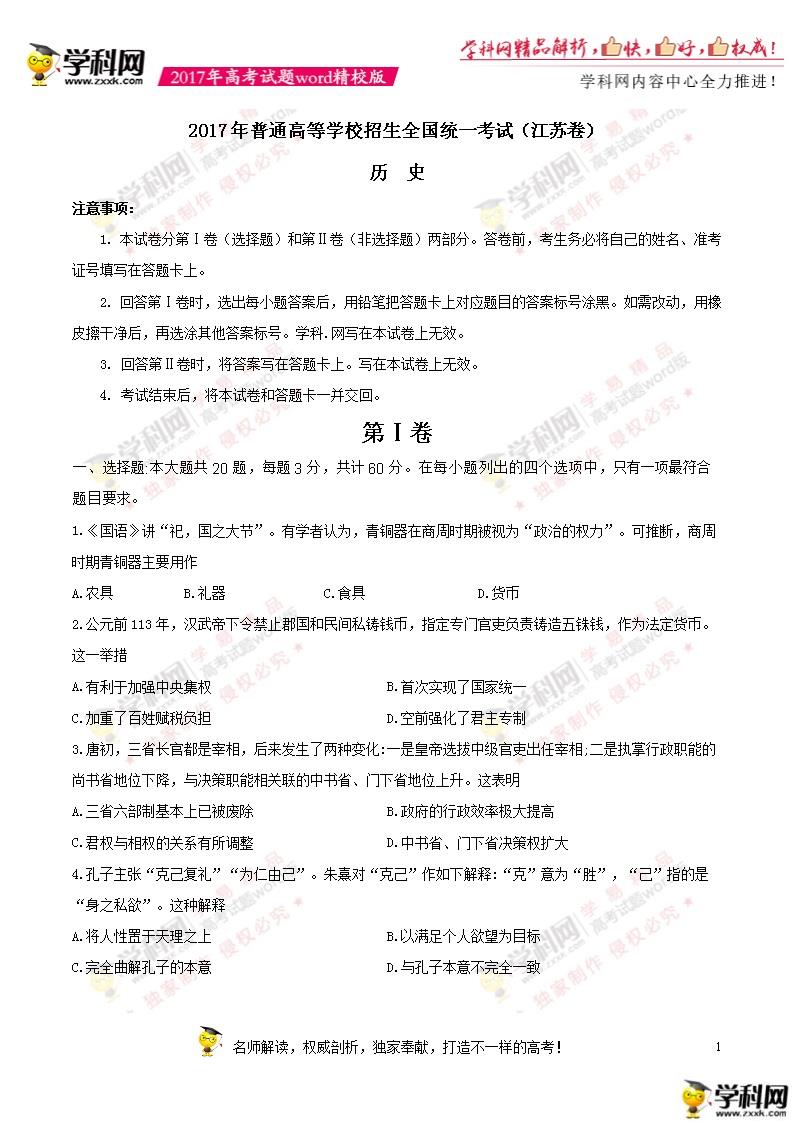 江蘇高考歷史2017年真題及答案(完整版)