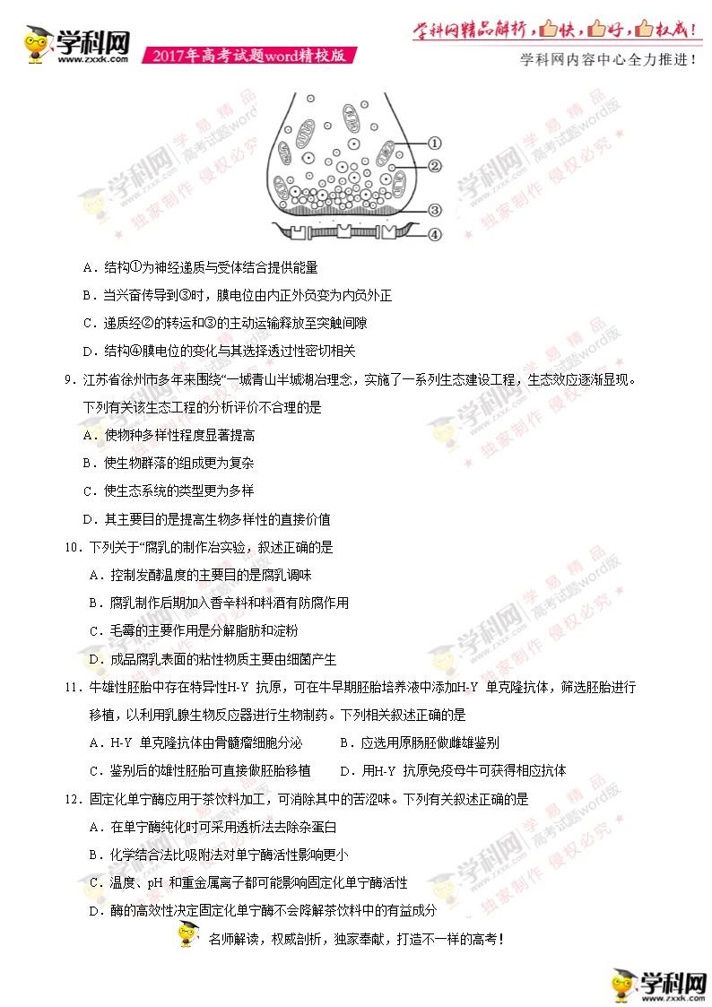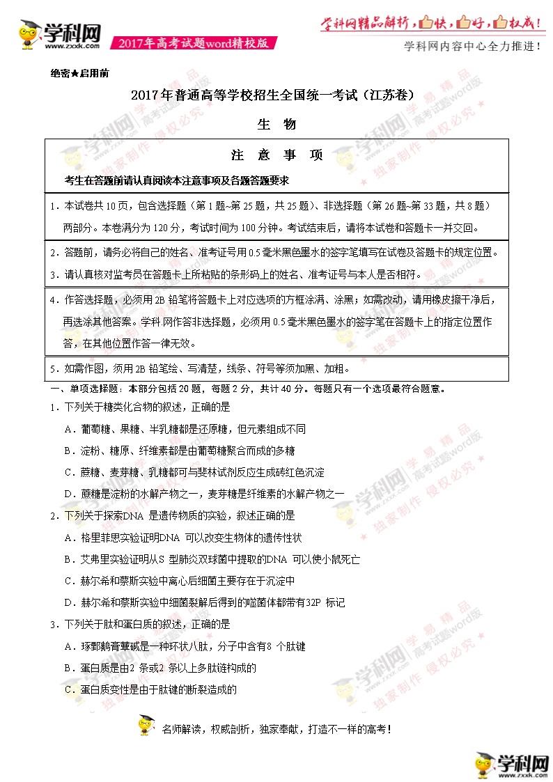 高考各科真題及答案已經(jīng)陸續(xù)公布,出國(guó)留學(xué)網(wǎng)高考頻道為大家提供2017江蘇高考生物試題附答案解析發(fā)布 ,希望能幫助大家順利估分。更多高考分?jǐn)?shù)線、高考成績(jī)查詢、高考志愿填報(bào)、高考錄取查詢信息等信息請(qǐng)關(guān)注我們網(wǎng)站的更新!