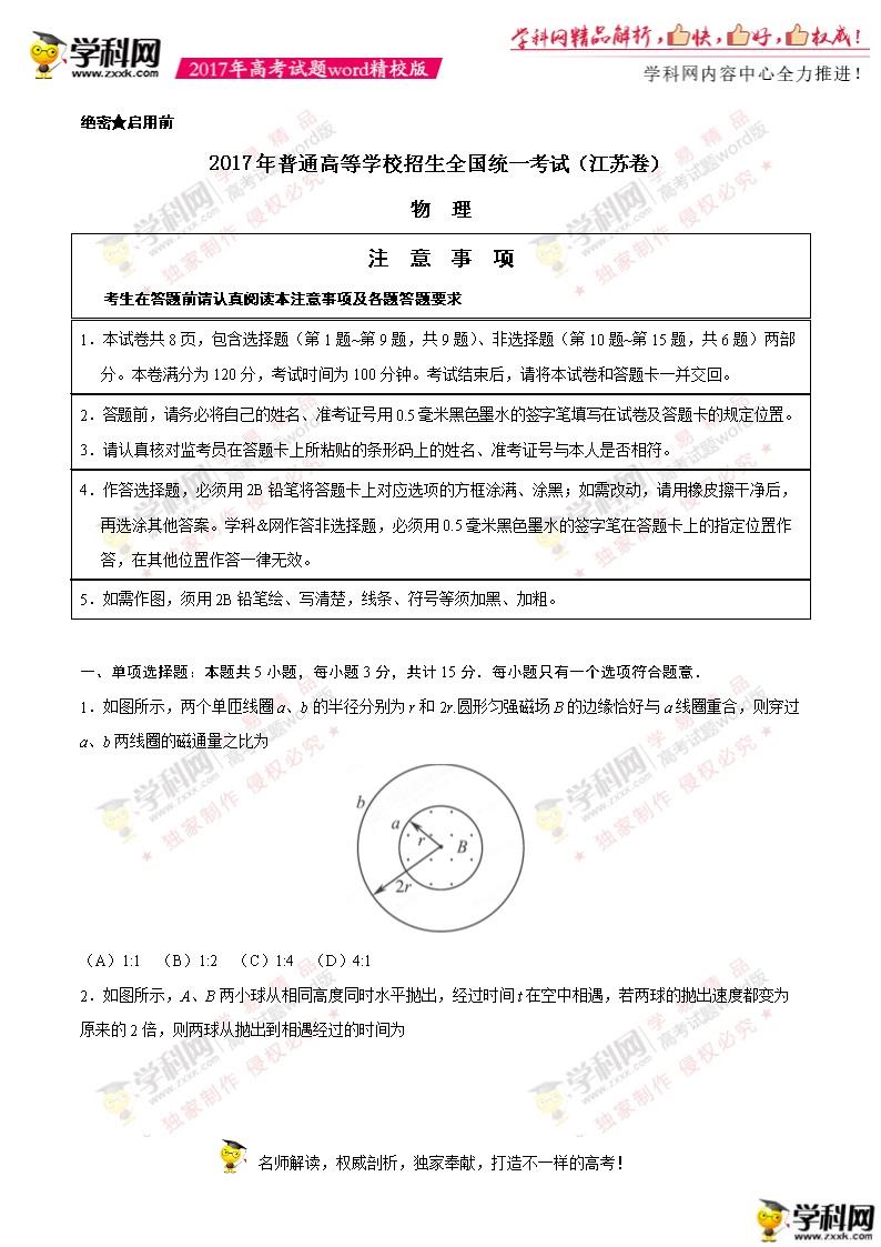 江蘇高考物理2017年真題及答案(完整版)