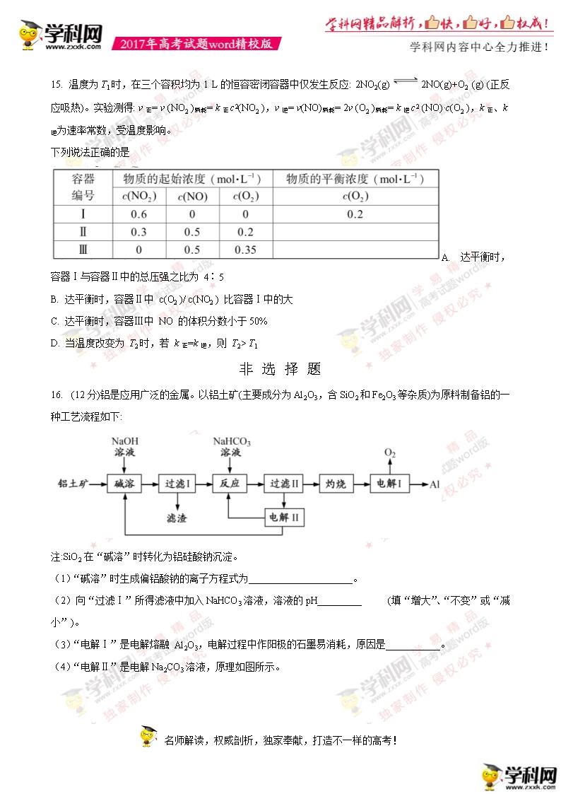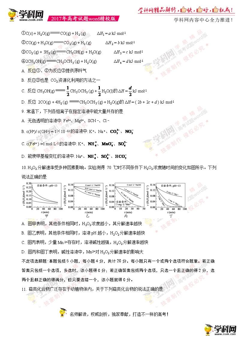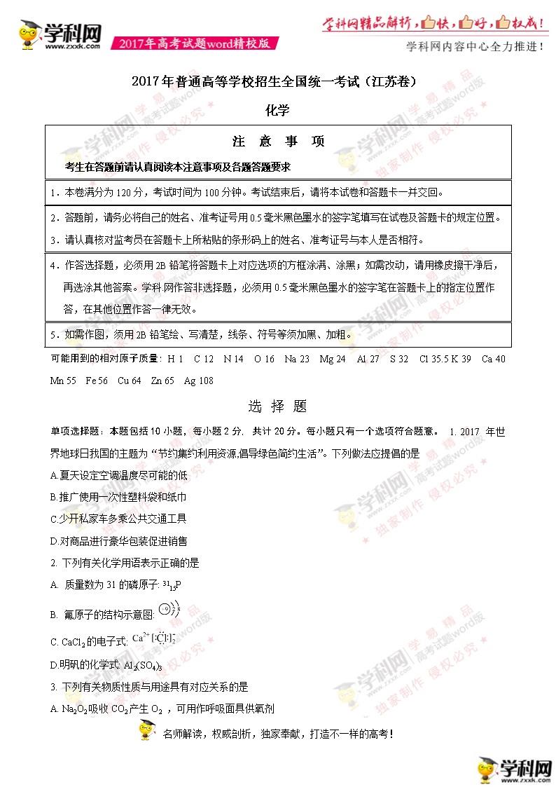江蘇高考化學(xué)2017年真題及答案(完整版)