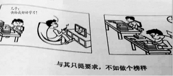 As is clearly shown in the first picture, a father is watching a video while telling his son to study hard. In the second picture, another father is studying just as his son is doing. What the two pictures intend to illustrate is: rather than make requests to your kids, why not set an example for them?