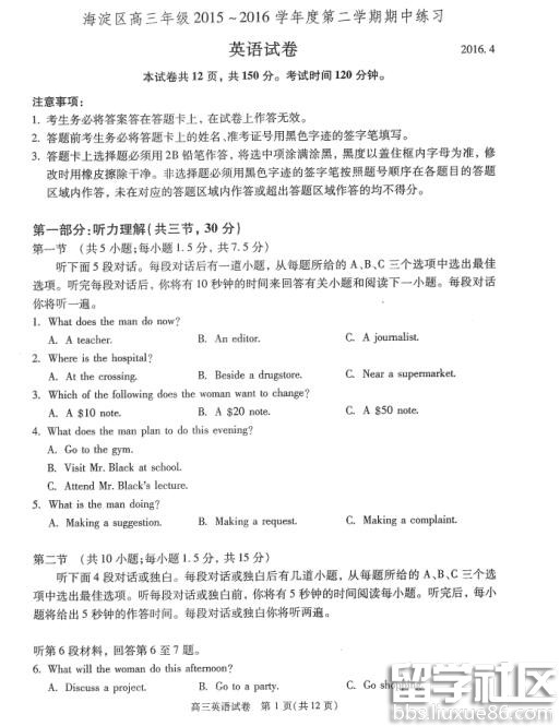 2016北京海淀區(qū)高三一模將于4月12日-13日考試,以下是出國(guó)留學(xué)網(wǎng)高考網(wǎng)小編整理的2016北京海淀區(qū)高三一模英語(yǔ)試題及答案,供同學(xué)們參考學(xué)習(xí)。同學(xué)們可收藏本頁(yè)面,便于考試后查看。