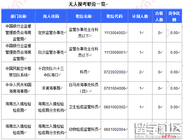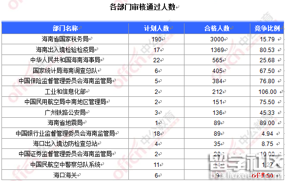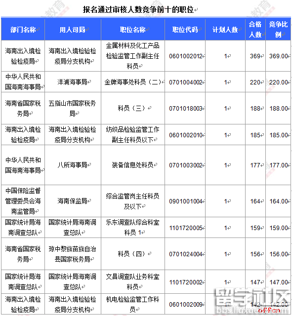 報(bào)名通過(guò)審核人數(shù)前十的職位主要集中在海南出入境檢驗(yàn)檢疫局、海南省國(guó)家稅務(wù)局、中華人民共和國(guó)海南海事局等部門,具體信息如下: