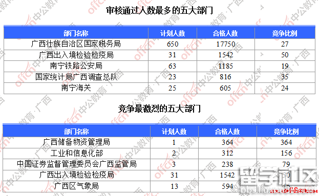 為幫助廣大考生更清晰的了解今日報名情況,廣西中公教育整理了審核通過人數前五位的部門以及競爭比例最激烈的五大部門,供廣大考生參考: