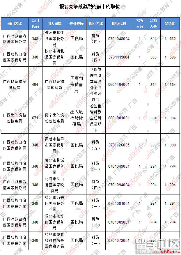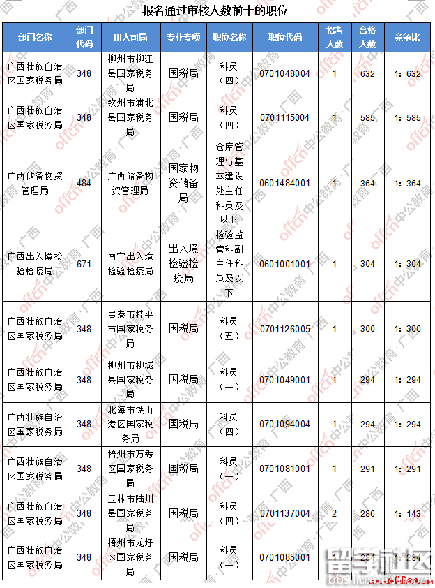 報名通過審核人數前十的職位主要集中在廣西壯族自治區(qū)國家稅務局、廣西儲備物資管理局、廣西出入境檢驗檢疫局等部門,具體信息如下: