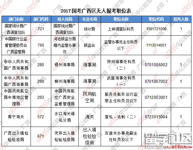截止到22日16時,工作地點在廣西的職位共有7個無人報考,僅占全部職位的1%。下面是部分廣西無人報考職位一覽表,廣西中公教育專家建議廣大考生結合自身條件,根據自己的實際情況找到屬于自己的最佳職位,避免激烈競爭。
