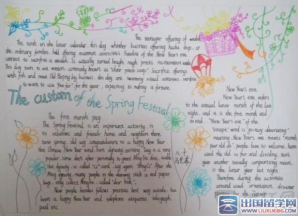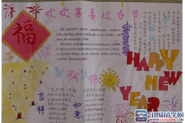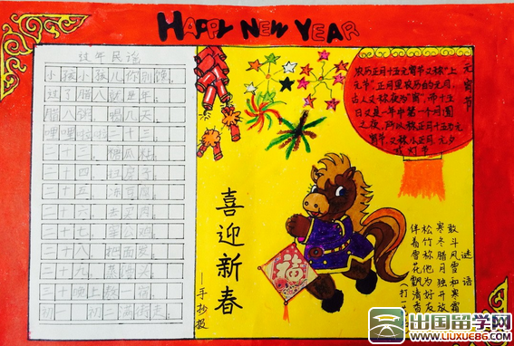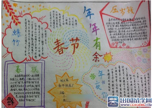 優(yōu)秀的春節(jié)手抄報(bào)因該是書(shū)面整潔,版面分塊清楚,字跡工整,圖案適合主題,顏色搭配較好,主題突出。下面是由出國(guó)留學(xué)網(wǎng)整理的2016春節(jié)手抄報(bào)內(nèi)容,歡迎閱讀。更多相關(guān)春節(jié)手抄報(bào)文章,請(qǐng)關(guān)注本欄目。