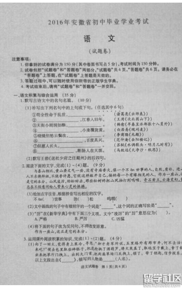 出國留學(xué)網(wǎng)為您提供2016年安徽六安中考語文試卷及答案,詳細(xì)內(nèi)容如下,希望能對大家有所幫助!更多中考真題盡在出國留學(xué)網(wǎng)!