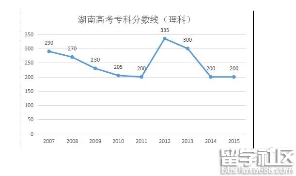 2013-2015年湖南高考文科??品謹?shù)線一直保持在200分,由湖南歷年高考文科??品謹?shù)線走勢圖可以預(yù)測2016湖南高考文科??品謹?shù)線預(yù)計在200分左右。 (以上數(shù)據(jù)僅供參考!)