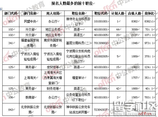 從報(bào)考人數(shù)上來(lái)看,截止24日8時(shí),34個(gè)職位已經(jīng)“破千”,其中,3個(gè)職位的報(bào)名人數(shù)已經(jīng)突破2000千,而外交部地區(qū)業(yè)務(wù)司英語(yǔ)一(職位代碼 401001001)一職成為今年第二個(gè)突破了3000大關(guān)的職位;從競(jìng)爭(zhēng)比上來(lái)說(shuō),除民盟中央辦公廳接待處主任科員及以下(職位代碼為 101001001)一職位于難以企及的“八千挑一”的“巔峰”之外,另外,還有8個(gè)職位是“千里挑一”的職位,這與去年同期相比,前十個(gè)職位競(jìng)爭(zhēng)比都在 1107:1之上相較,今年報(bào)考“冷熱兩重天”的特點(diǎn)異常顯著,國(guó)家公務(wù)員考試網(wǎng)專家提醒考生,在選擇職位準(zhǔn)備“下手”時(shí),一定要保持頭腦清醒,切勿盲目跟風(fēng)。