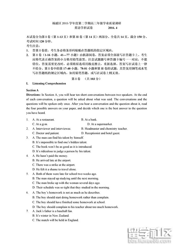 2016上海市楊浦區(qū)高三二??荚囈呀Y(jié)束,以下是出國留學(xué)網(wǎng)高考網(wǎng)小編整理的2016上海市楊浦區(qū)高三二模英語試題及答案,供同學(xué)們參考學(xué)習(xí)。