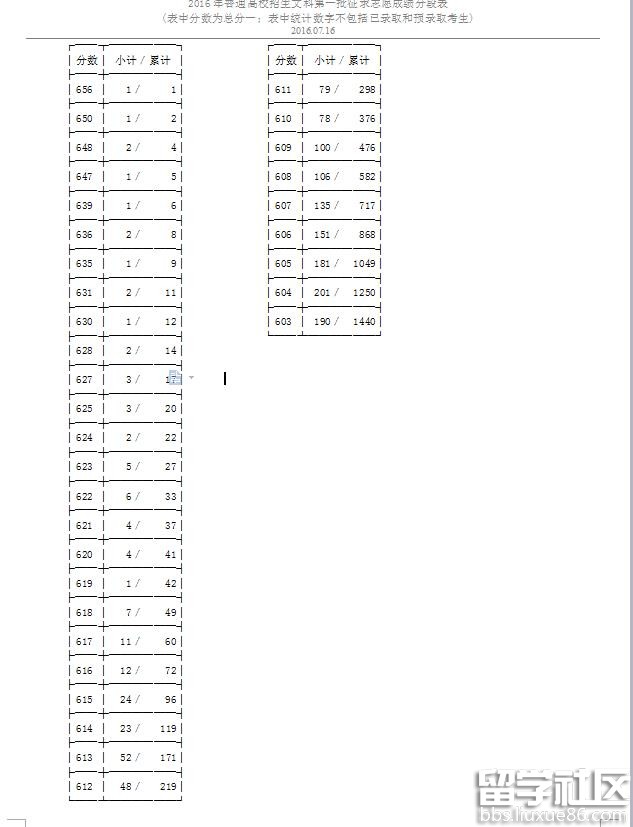 浙江2016普通高校招生文科第一批征求志愿成績分段表