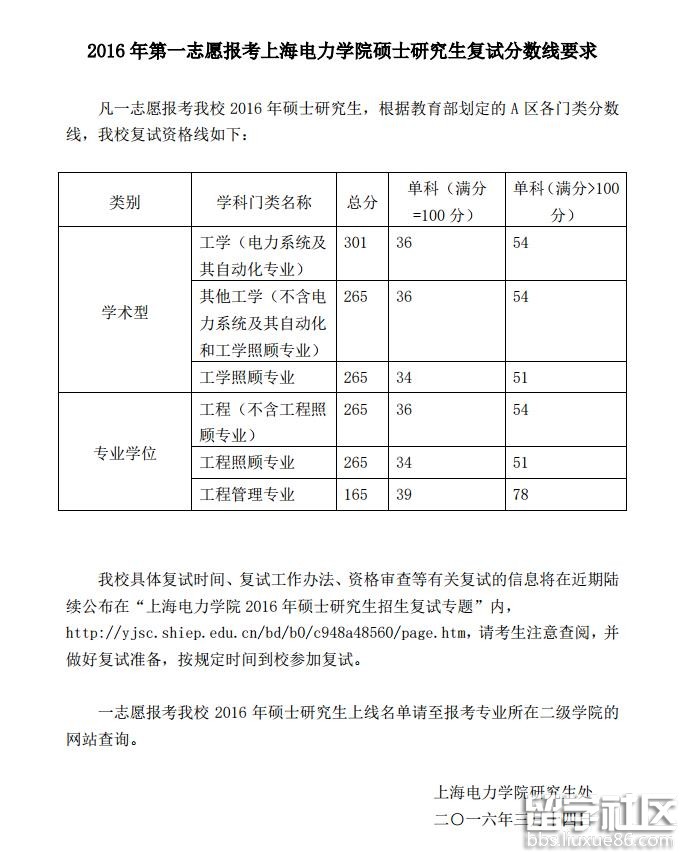 2016年第一志愿報(bào)考上海電力學(xué)院考研復(fù)試分?jǐn)?shù)線要求