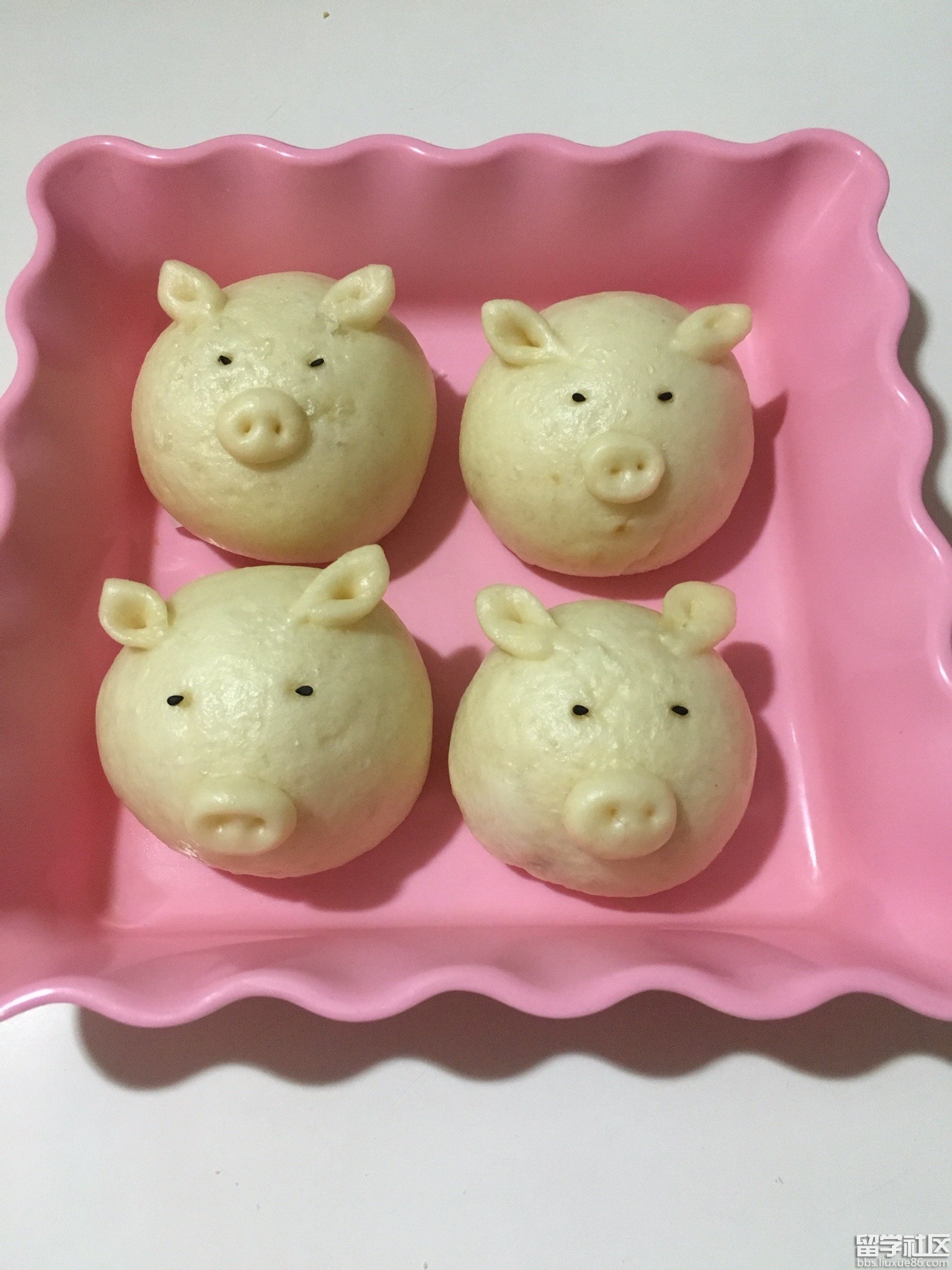 6、分別把鼻子耳朵燒沾點(diǎn)水粘上豬身體,用牙簽在鼻子上戳兩個洞,眼睛用芝麻點(diǎn)綴;