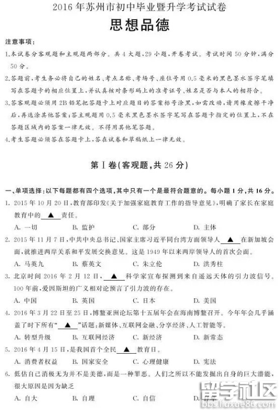 下面是由出國(guó)留學(xué)網(wǎng)整理的江蘇省蘇州市2016年中考政治試題(含答案),歡迎閱讀。