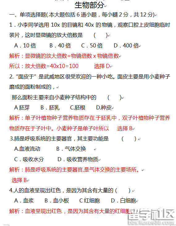 2016甘肅定西中考生物試題及答案解析