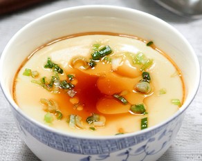 3、入蒸籠大火蒸15分鐘。拿出蒸好的雞蛋羹,淋下香油,醬油,撒上蔥花即可。