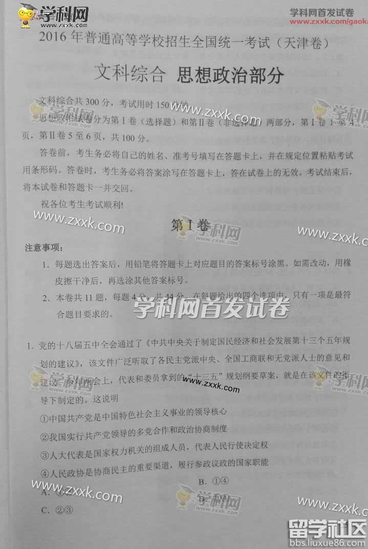 高考是夢想開始的地方,是人生重要的轉(zhuǎn)折點,每一個人對高考都有自己獨一無二的感受。2016年高考已經(jīng)落幕,下面是出國留學(xué)網(wǎng)高考頻道為廣大考生提供2016年天津高考文綜試卷及答案正式公布。如果你想找的真題及答案沒有顯示,可按Ctrl F5進(jìn)行刷新!更多天津高考分?jǐn)?shù)線、天津高考成績查詢、天津高考志愿填報、天津高考錄取查詢信息等信息請關(guān)注本站的更新!