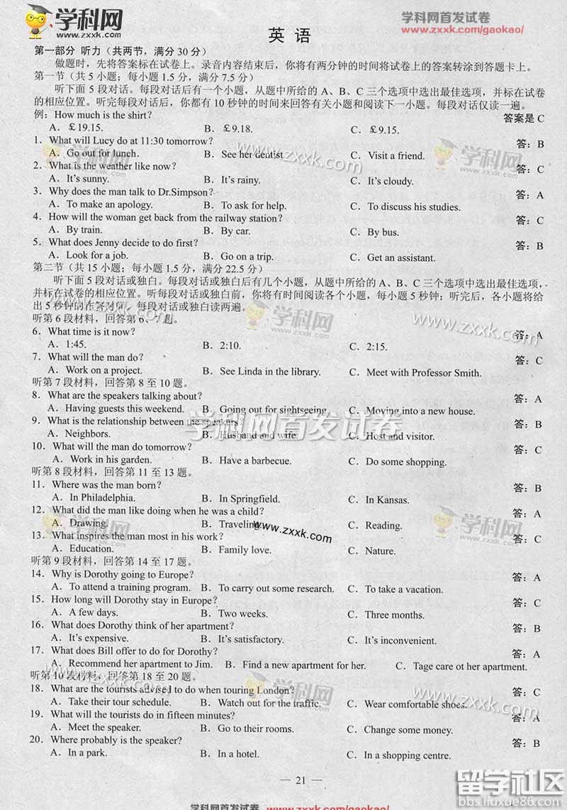 隨著終考鈴聲的響起,2016年高考已經(jīng)完美收官,不論成績是好是壞,學(xué)生們都從此刻開始了下一階段的學(xué)習(xí)生活。出國留學(xué)網(wǎng)出國留學(xué)網(wǎng)高考頻道為您提供2016安順高考英語真題及答案正式公布。如果您想要找的真題及答案沒有顯示,可按Ctrl F5進(jìn)行刷新。同時建議大家按Ctrl D收藏本網(wǎng)站!更多安順高考分?jǐn)?shù)線、安順高考成績查詢、安順高考志愿填報、安順高考錄取查詢信息等信息請關(guān)注我們網(wǎng)站的更新!