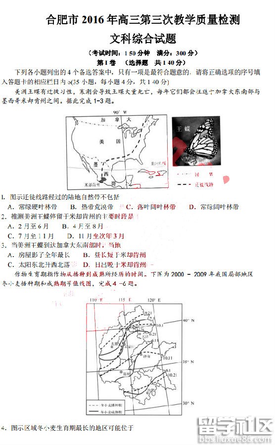 2016合肥三模文綜考試已經(jīng)結(jié)束,出國(guó)留學(xué)網(wǎng)高考網(wǎng)小編整理了2016合肥三模文綜試題,2016合肥三模緊扣高考大綱,不僅可以檢驗(yàn)考生的復(fù)習(xí)情況,還能讓考生從中總結(jié)經(jīng)驗(yàn)、查漏補(bǔ)缺,同時(shí)也是對(duì)高考生心理承受力的一次錘煉?!军c(diǎn)擊查看:2016合肥三模試題及答案匯總(9科全)】2016合肥三模文綜試題具體內(nèi)容如下: