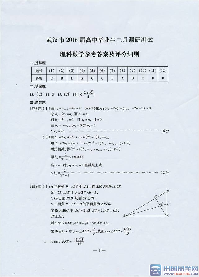 出國留學網高考網為大家提供2016年武漢二月調考理科數(shù)學答案,更多高考數(shù)學復習資料請關注我們網站的更新!